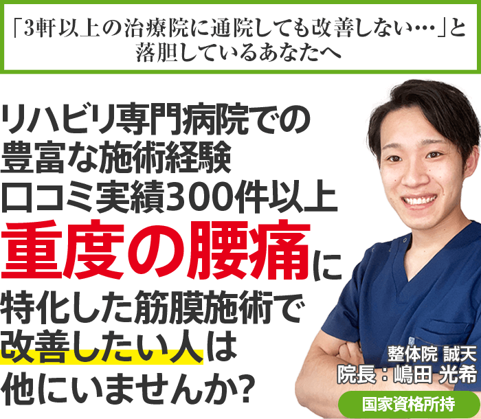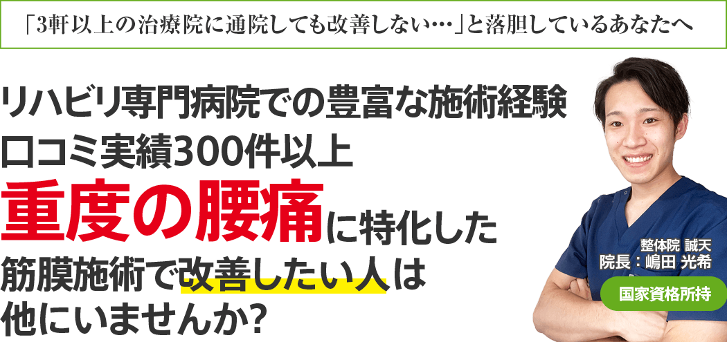 今後の人生において、腰痛を我慢しいろんな治療院に通い続ける人生でいいのですか?迷いなく「NO」と即答できたのであれば、今すぐ整体院誠天へお電話ください。