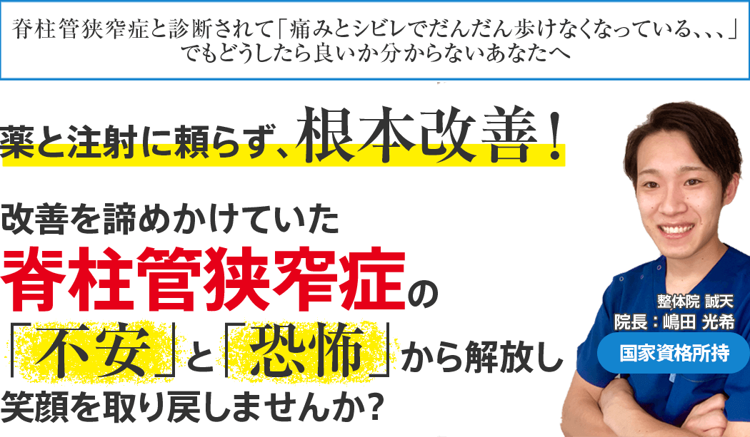 「脊柱管狭窄症最後の砦」である明石市で唯一の脊柱管狭窄症専門整体院 誠天に来院し、もう二度と脊柱管狭窄症で我慢することのない人生を手に入れる道。